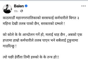 सरकारको दम्भका कारण सरसफाइ कर्मचारीले तीन महिनादेखि तलव खान नपाएको बालेनको आरोप छ ।