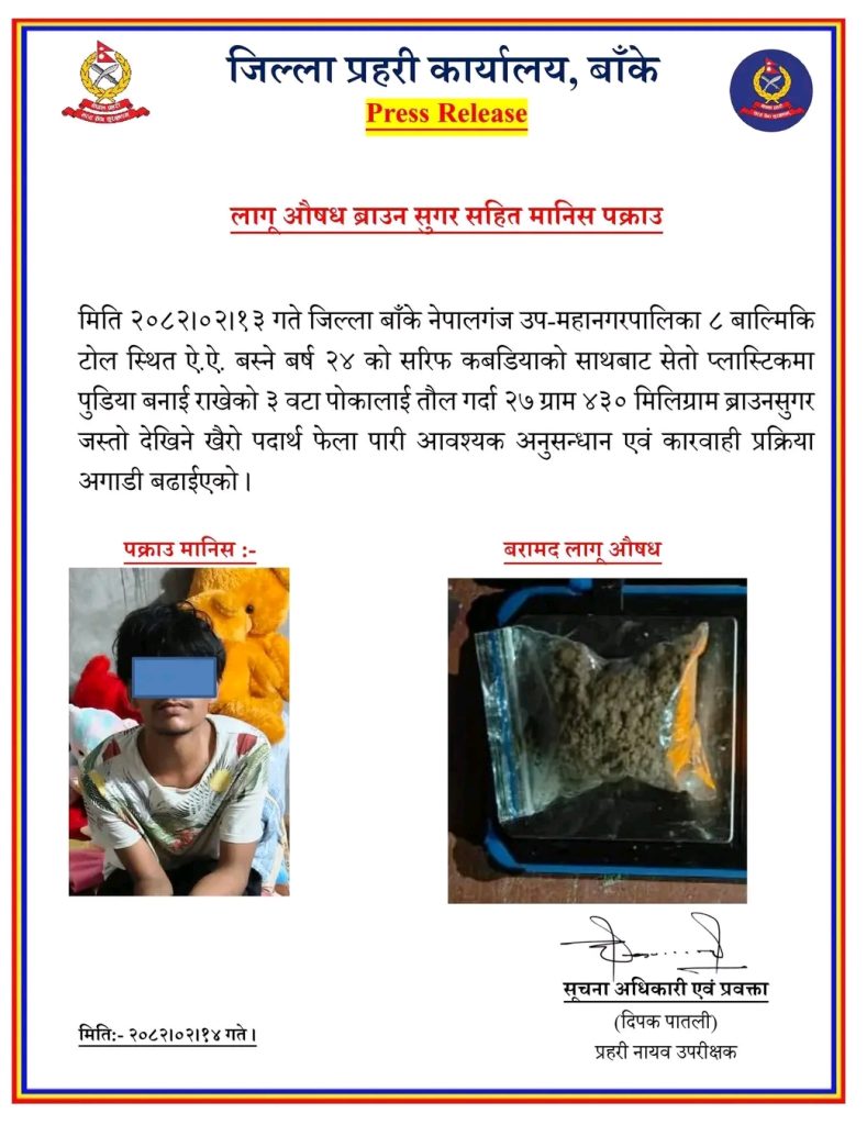 बाँके प्रहरीले २७ग्राम ४३० मिलिग्राम ब्राउनसुगरसहित एक जनालाई पक्राउ गरेको छ । पक्राउ पर्नेमा नेपालगन्ज उपमहानगरपालिका—०८का २४वर्षीय सरिफ कबाडिया रहेको एसपि राम प्रसाद घर्तीमगरले जानकारी दिए ।गोप्य सुचनाको आधारमा सरिफ कबाडियाले सेतो प्लास्टिकमा पुडिया बनाई राखेको ३ वटा पोका खानतलासी गर्दा ब्राउनसुगर फेला परेको बाँके प्रहरी प्रमुख एसपी राम प्रसाद घर्तीमगरले जानकारी दिए ।