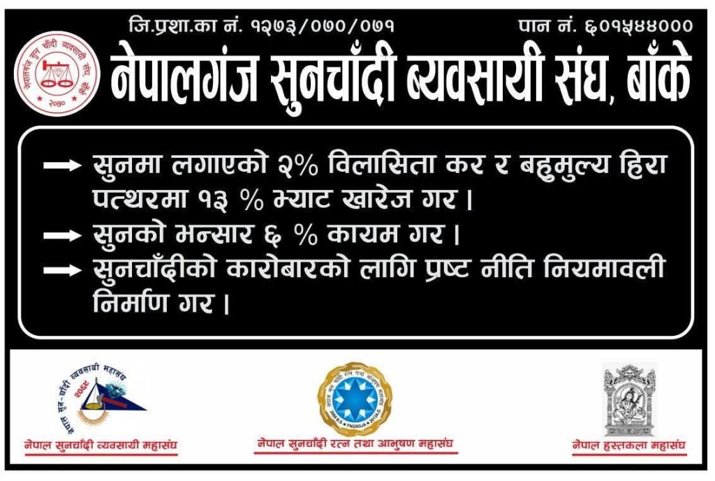 नेपाल सुनचाँदी रत्न तथा आभुषण व्यवसायी संघ र सुनचाँदी व्यवसायी संघले बुधबार संयुक्त प्रेस विज्ञप्ती जारी गर्दै यस्तो चेतावनी दिएका हुन् ।
