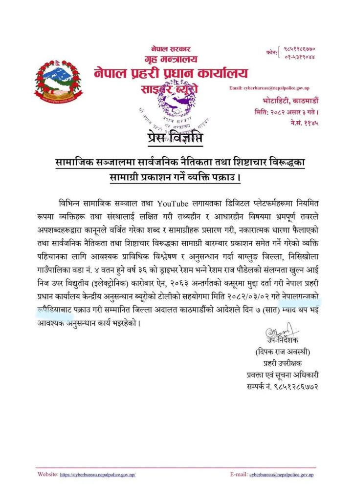 पौडेलले सार्वजनिक नैतिकता तथा शिष्टाचार विरूद्धका सामाग्री बारम्बार प्रकाशन समेत गर्ने गरेको घटनाको अनुसन्धानको क्रममा साइबर ब्यूरोबाट खटिएको प्रहरीले केन्द्रीय अनुसन्धान ब्यूरोको सहयोगमा सो कार्यमा संलग्न पौडेललाई नेपालगंज रूपैडियाबाट पक्राउ गरेको हो ।