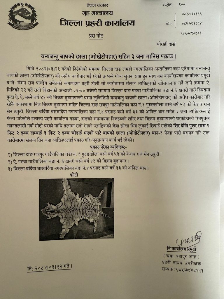 आइतबार दाङको देउखुरी, लमही नगरपालिका अन्तर्गत वडा एरियामा वन्यजन्तु बाघको छाला (ओखेटोपहार)को अवैध कारोबार भइरहेको भन्ने गोप्य सूचनाका आधारमा प्रहरीले छापामारेर ३ जनालाई नियन्त्रणमा लिएको विज्ञप्तिमा उल्लेख छ ।