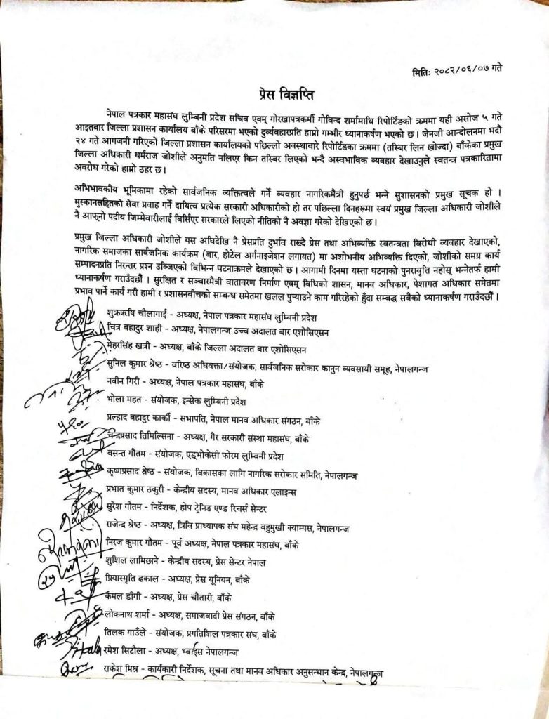 नेपाल पत्रकार महासंघ लुम्बिनी प्रदेशका अध्यक्ष शुक्रऋषि चौलागाई, नेपालगञ्ज उच्च अदालत बार एशोसिएसनका अध्यक्ष चित्र बहादुर शाही, बाँके जिल्ला अदालत बार एशोसिएसनका अध्यक्ष मेहरसिंह खत्री, वरिष्ठ अधिवक्ता सुनिल कुमार श्रेष्ठ, नेपाल पत्रकार महासंघ बाँकेका अध्यक्ष नवीन गिरी, इन्सेक लुम्बिनी प्रदेशका संयोजक भोला महतले विज्ञप्तिमा हस्ताक्षर गरेका छन् ।