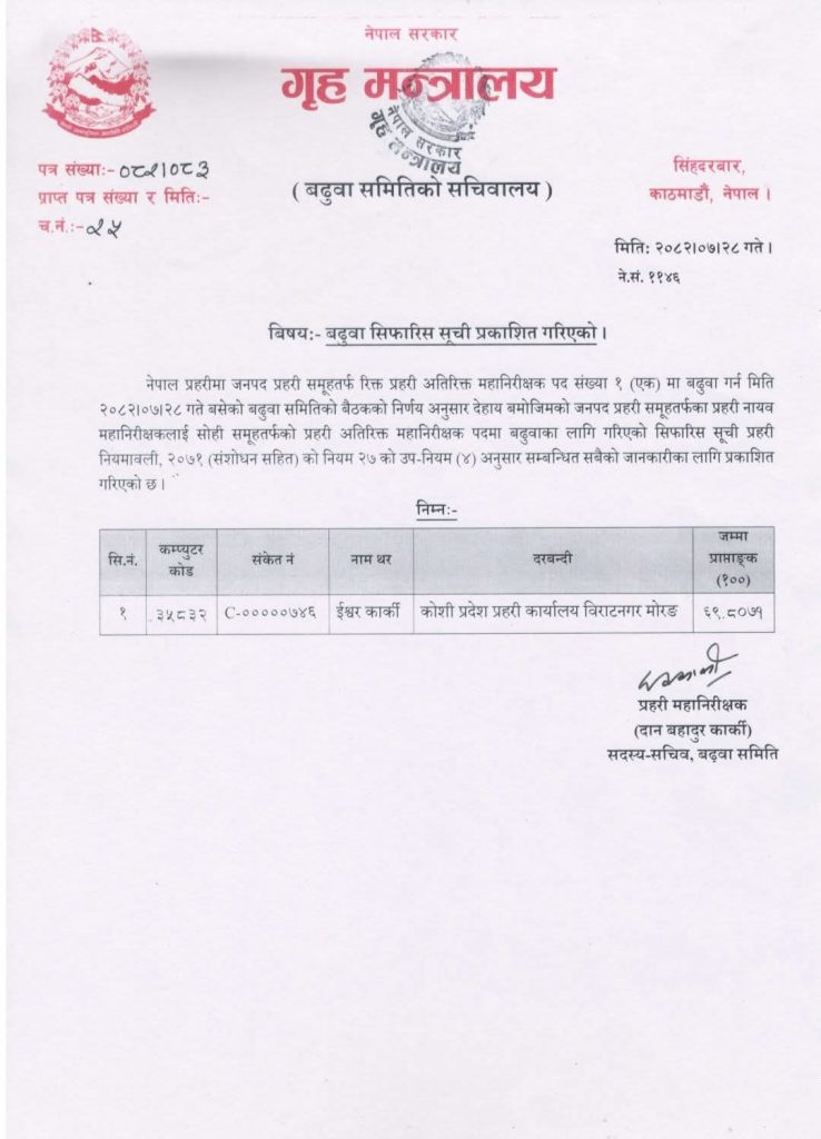 नेपाल प्रहरीको रिक्त अतिरिक्त महानिरीक्षक (एआईजी) मा डीआईजी ईश्वर कार्की सिफारिस भएका छन्।शुक्रबार बसेको बढुवा सिफारिस समितिको बैठकले कार्कीलाई एआईजीमा बढुवा गर्न सिफारिस गरेको